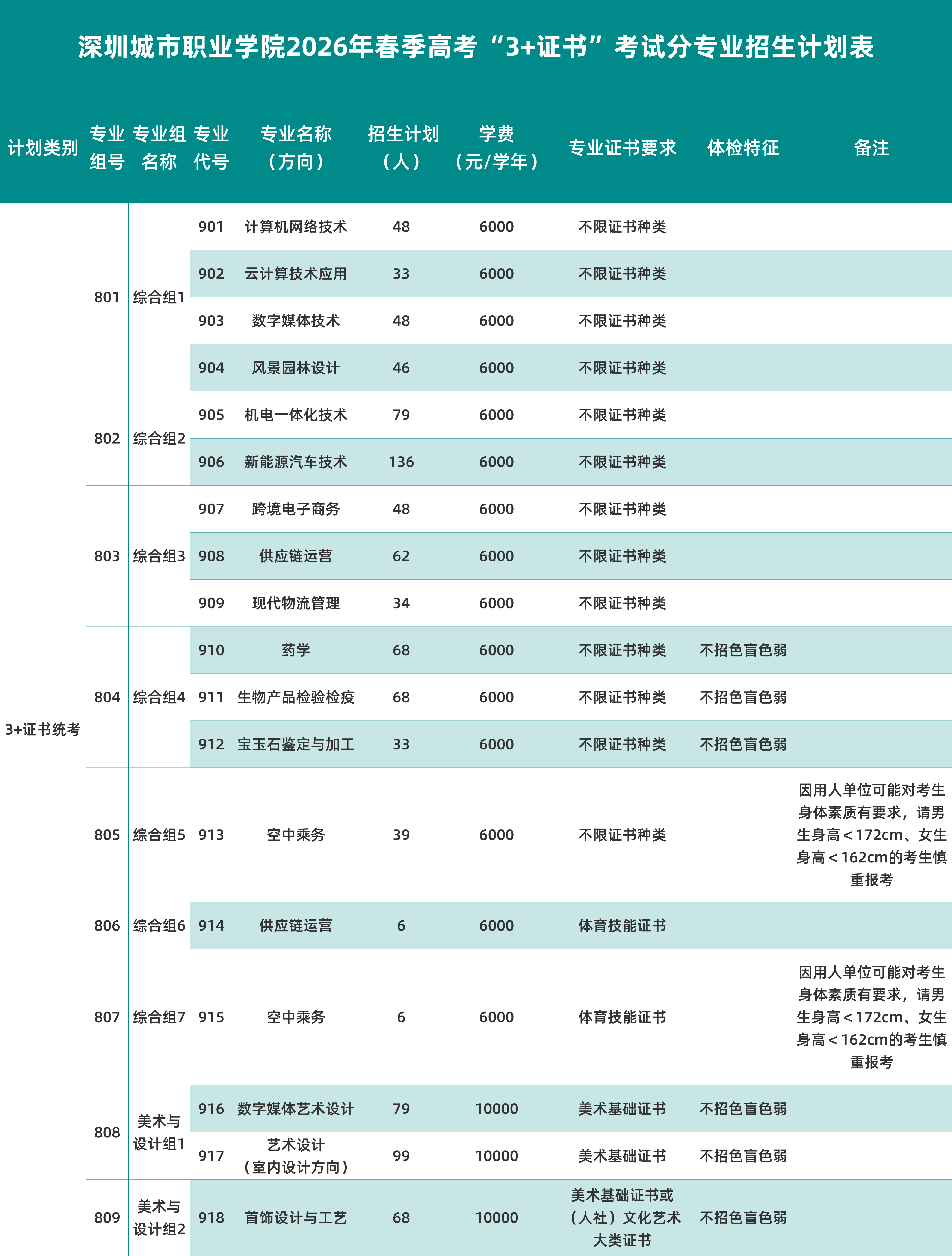 深圳城市职业学院2026年春季高考招生,依学考成绩录取和“3+证书”考试录取的投档录取均采用“院校专业组”模式。其中,依学考录取按类别设置专业组,普通类设4个专业组,美术与设计类设1个专业组;“3+证书”考试录取共设置9个专业组