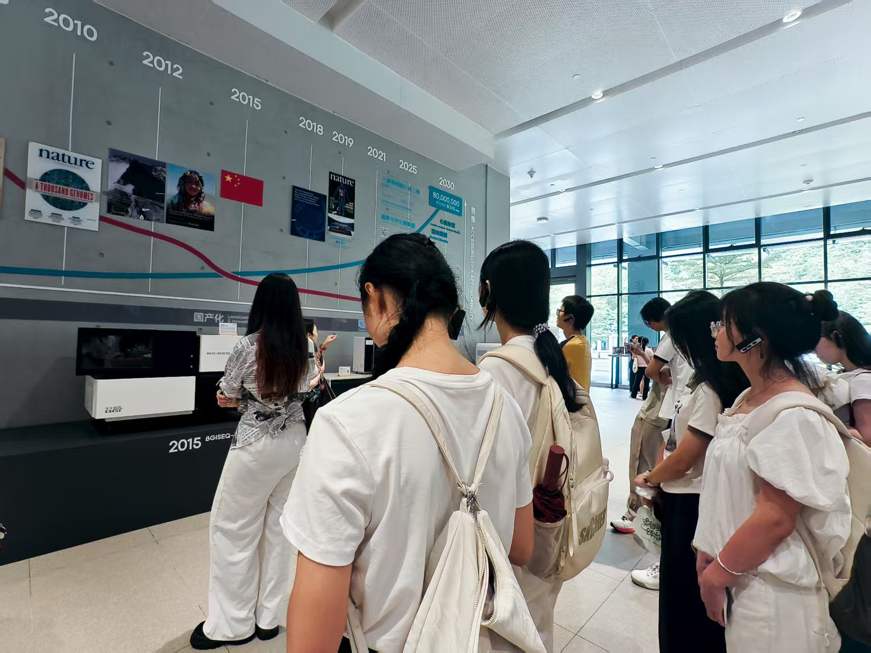 进入时空中心,新生们首先在序厅通过动态数据屏了解中心定位:这里不仅承担基因测序技术研发,更在动植物检疫、公共卫生应急检测等领域提供技术支持,曾为多地跨境检疫、突发疫病防控提供关键技术保障。随后,在工作人员引导下,新生们分批次进入核心参观区域,全程严格遵循生物安全防护规范,近距离观察技术应用场景。